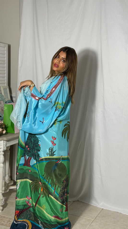 عباية ساتان سماوي بطبعات طبيعية