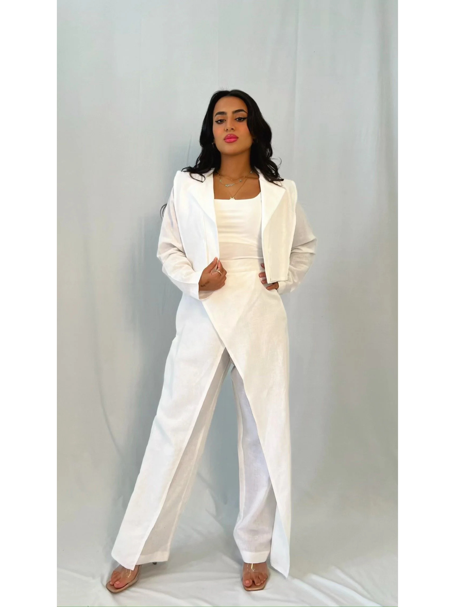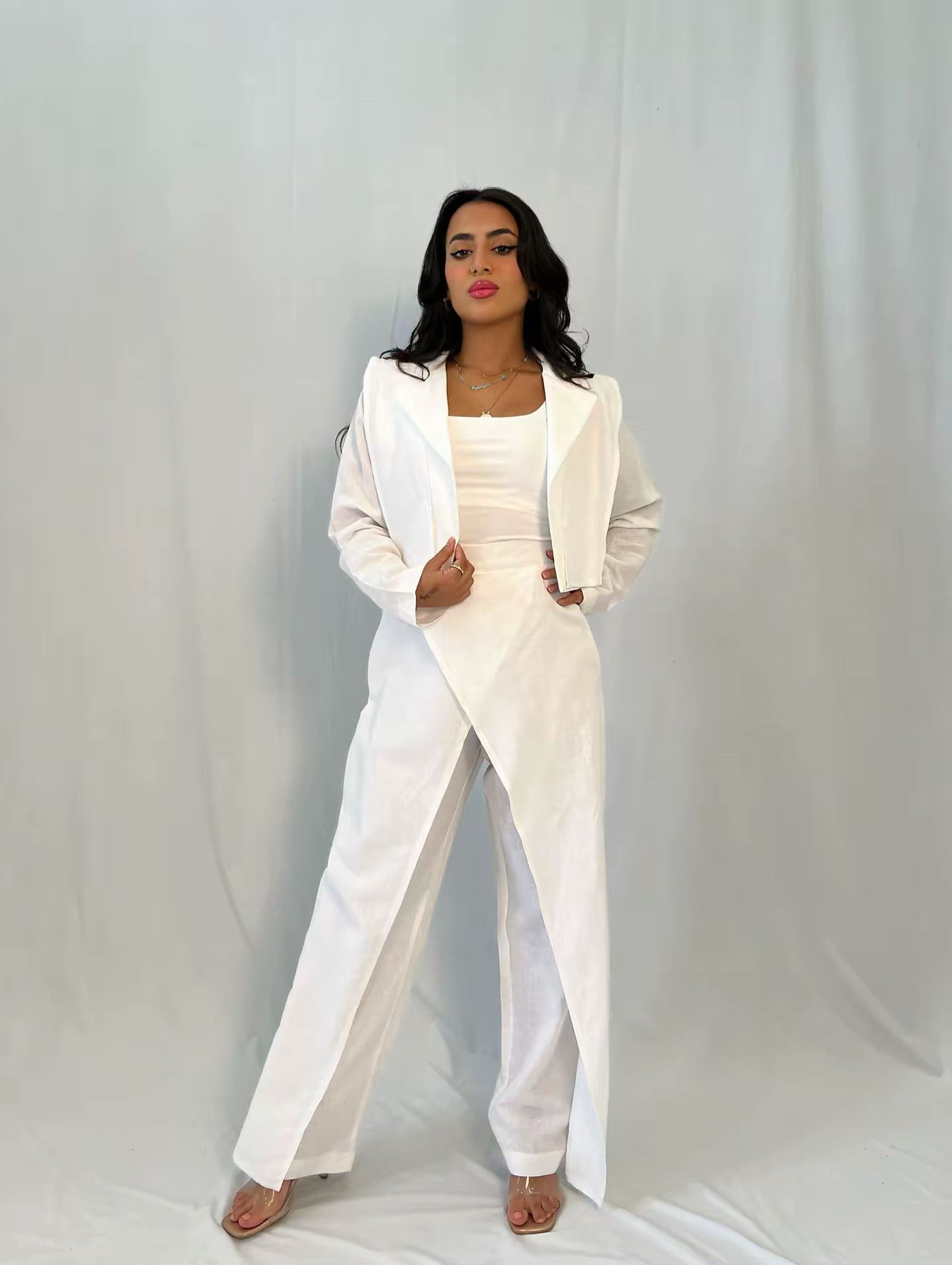طقم بدلة أبيض بتنسيق عملي وراقي يرفع إطلالتك فورًا؛ تصميمه الطويل يمنحك حضورًا فخمًا وخطوطًا مرتبة تناسب مشاويرك اليومية والمناسبات بنفس الثقة، مع بنطال بقصة مستقيمة يسهل تنسيقه مع توب بسيط أو إكسسوارات ناعمة.