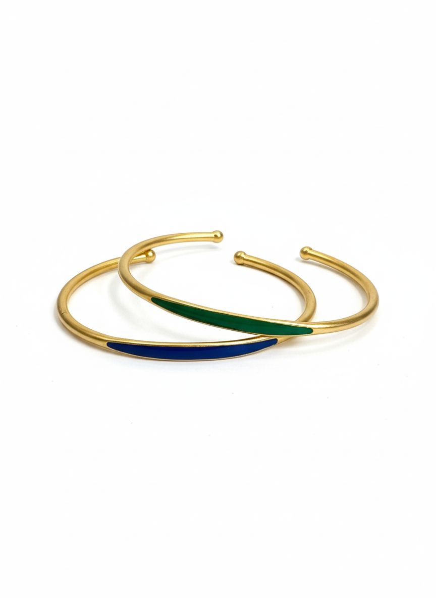 إسورتان مفتوحتان بتصميم عصري بسيط مطلي بالذهب، بتفاصيل مينا أنيقة باللونين الأخضر الزمردي والأزرق الملكي، تمنحك لمسة رقي هادئة تكمّل إطلالتك اليومية والسهرة بدون مبالغة.