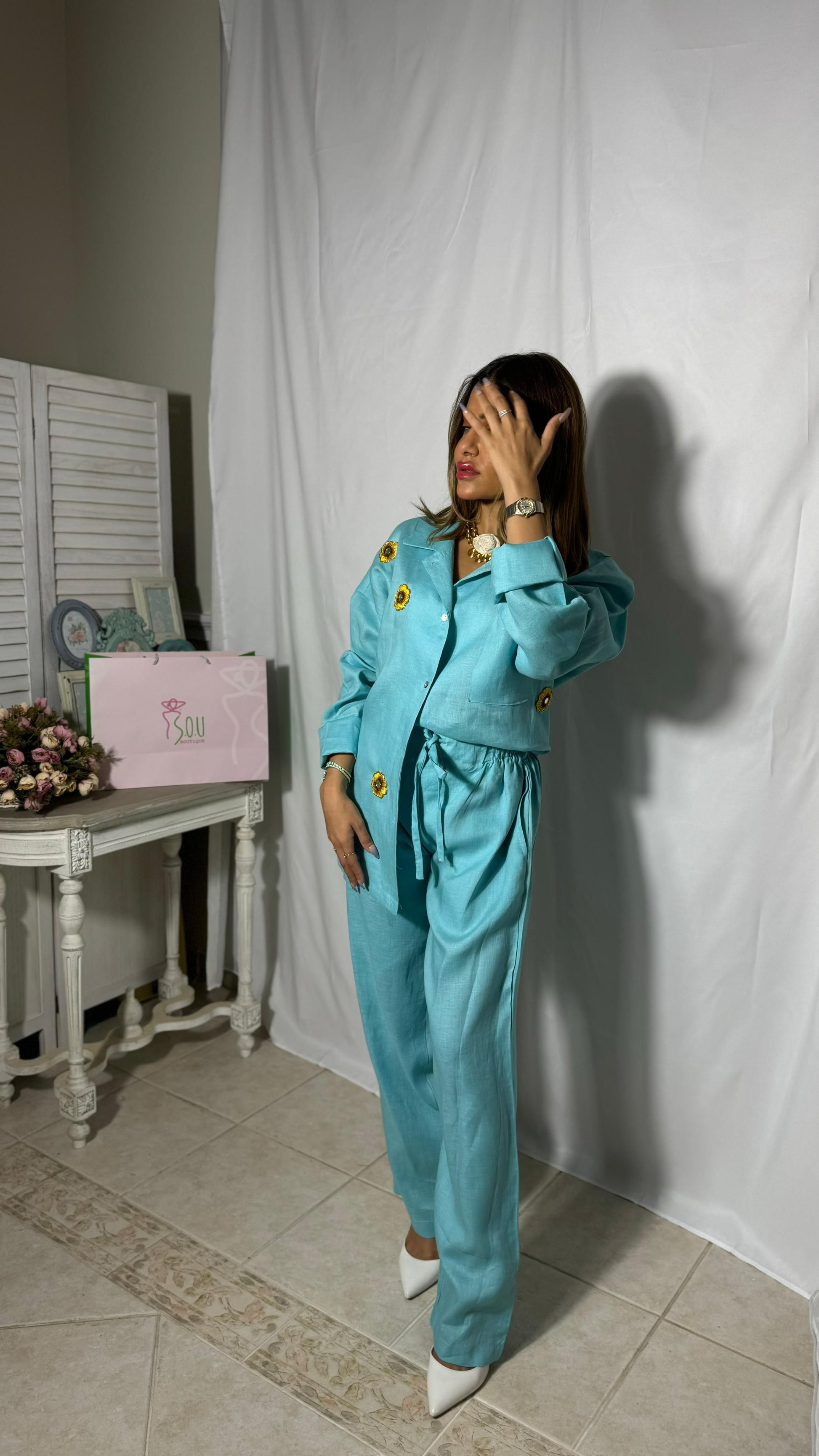 طقم بلوزة وبنطلون باللون الأزرق الفيروزي يجمع بين الفخامة والراحة في إطلالة واحدة؛ قماشة خفيفة وانسيابية تناسب أجواء السعودية، مع لمسات أنثوية راقية وتطريز زهور دوّار الشمس الذي يضيف بهجة وتميّز من غير أي تكلف. خيار مثالي للمشاوير الصباحية واللقاءات العفوية.