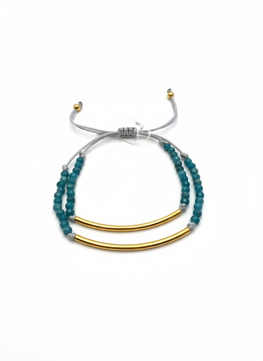إسورة عصرية بتصميم مزدوج أنيق تمزج بين الخرز الفيروزي الهادئ والأنابيب المعدنية المطلية بالذهب، لتمنحك توازناً جميلًا بين البساطة والجاذبية في كل إطلالة. قطعة خفيفة وملفتة تكمّل ستايلك اليومي بكل ذوق.
