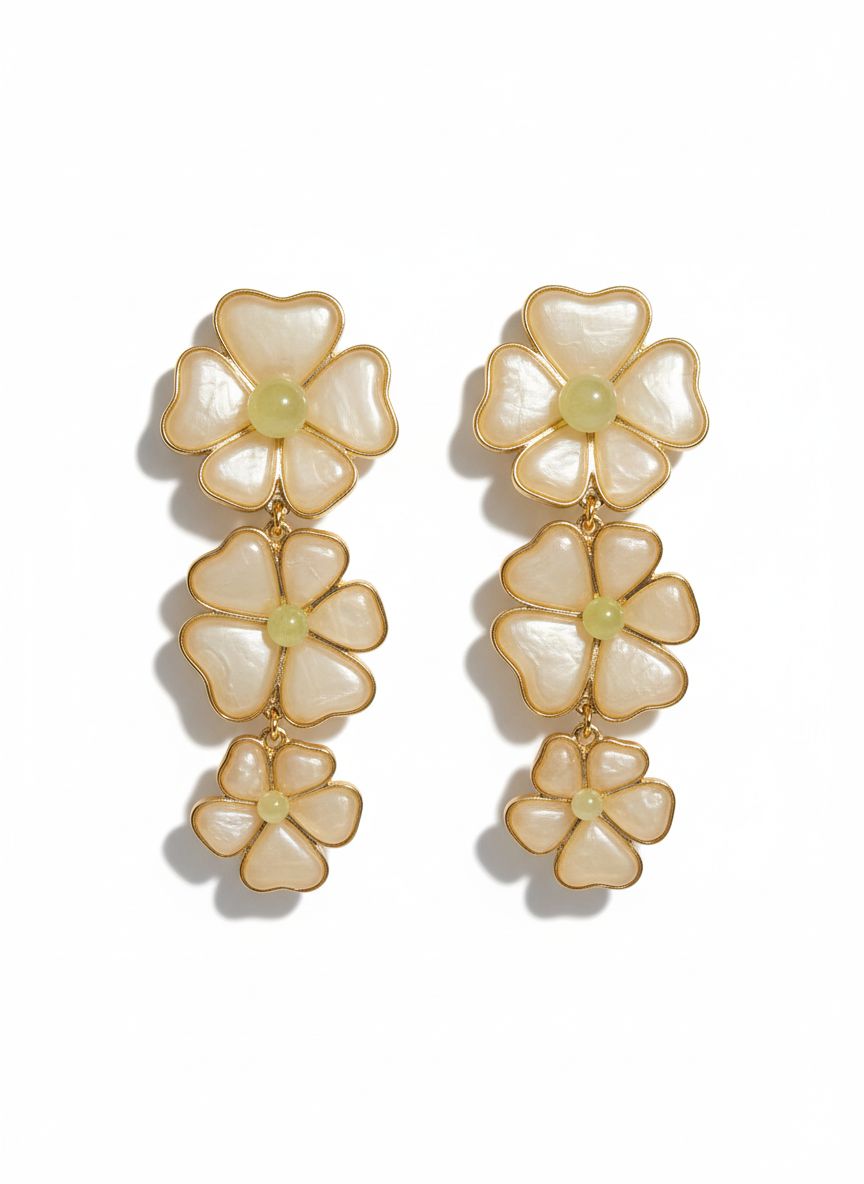 حلق ذهبي بتصميم زهور أنثوي راقٍ يفيض نعومة وجمالاً، مكوّن من ثلاث زهرات متدرجة الأحجام بتفاصيل لؤلؤية لامعة تمنح إطلالتك لمسة فخامة هادئة—مثالي للدوام والمشاوير، ويكمل أناقتك في السهرات بذوق سعودي أنيق.