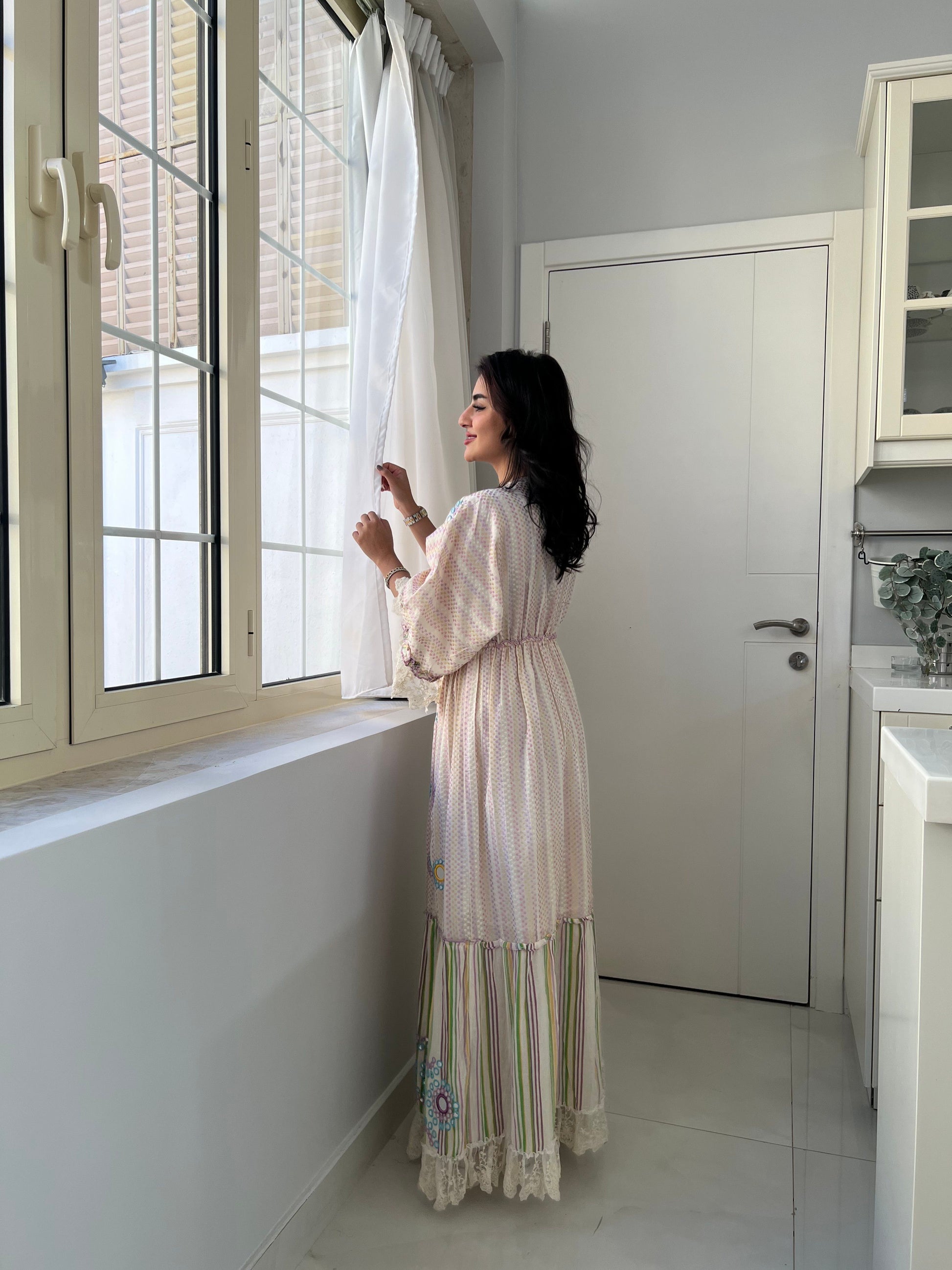 مع الجلابية الكريمية المنفوشة، تجسّد هذه الإطلالة هدوء الصباح وأناقة البساطة في أبهى صورها. جلابية طويلة بتصميم أنثوي رقيق يجمع بين الألوان الهادئة والنقوش الدقيقة، لتمنحك حضورًا ناعمًا ومميزًا سواء في البيت أو في مشاوير النهار الخفيفة.