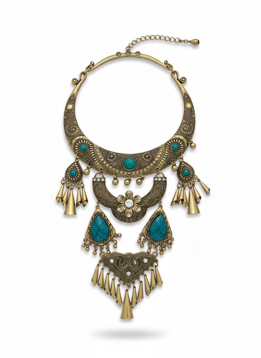 يمنحك عقد تراثي مزخرف بالأحجار الفيروزية حضوراً لافتاً يجمع بين فخامة الفن الشرقي ولمسة الأناقة العصرية؛ تفاصيله المنقوشة بدقة وتناسق أحجاره الفيروزية يكمّلان إطلالتك في المناسبات والسهرات ويتركان انطباعاً لا يُنسى.
