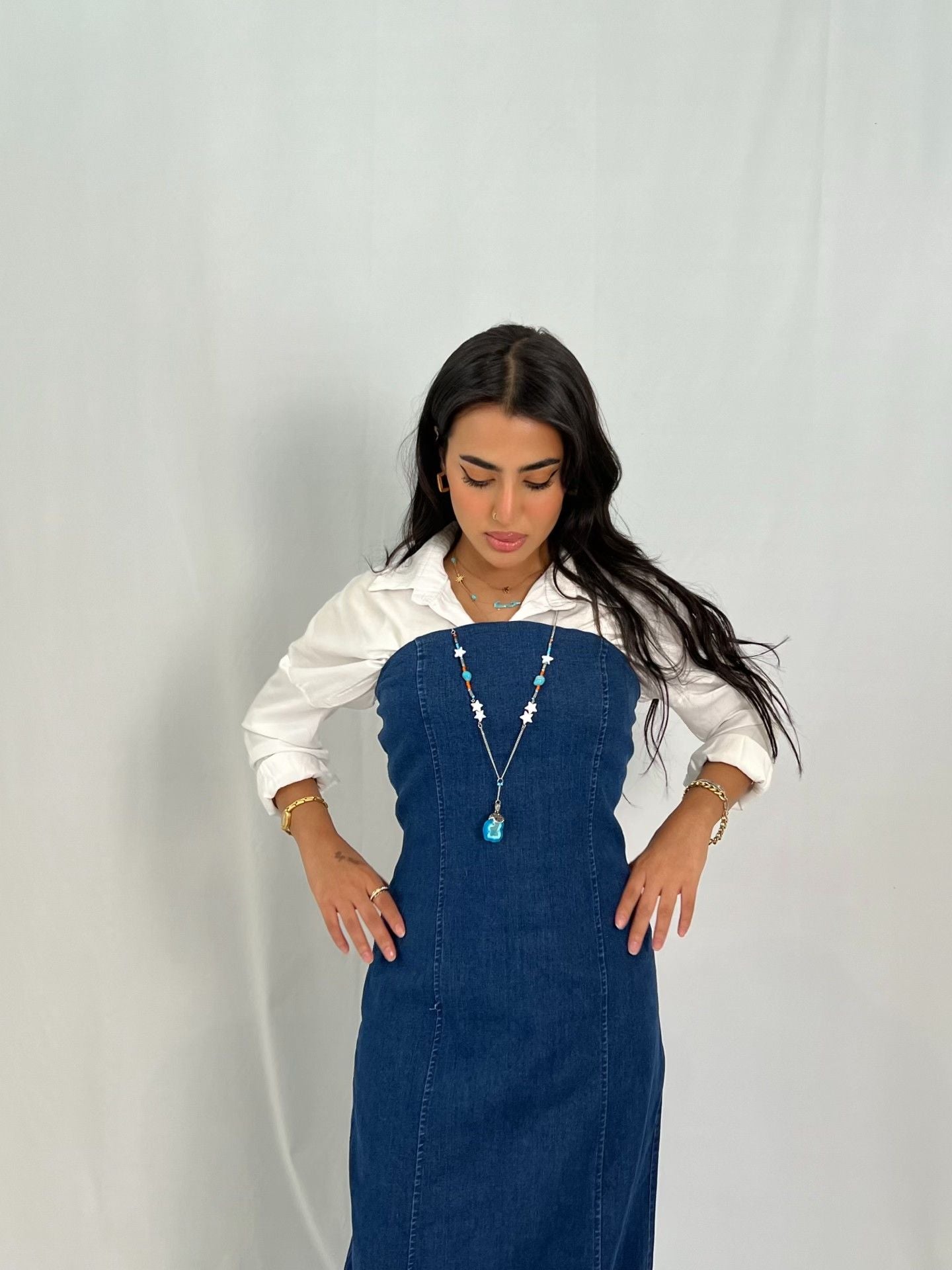 فستان جينز طويل باللون الأزرق يمنحك إطلالة أنيقة وعصرية تجمع بين الكلاسيكي والكاجوال الراقي؛ قطعة واحدة ترفع الستايل فورًا وتناسب مشاويرك اليومية واللقاءات غير الرسمية بذوق وبدون تكلّف.