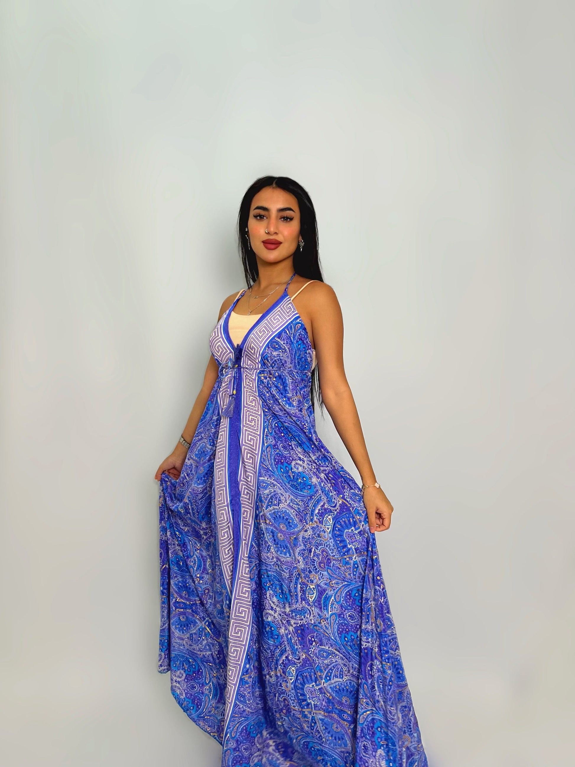 فستان ماكسي بنقوش زرقاء مستوحاة من البحر يمنحك حضورًا آسِرًا وإطلالة تنبض بالأنوثة والرقي؛ تصميمه الانسيابي وتفاصيله اللافتة يبرزان جمال القوام ويجعلانك جاهزة لمناسبات الصيف والسهرات بذوق راقٍ.