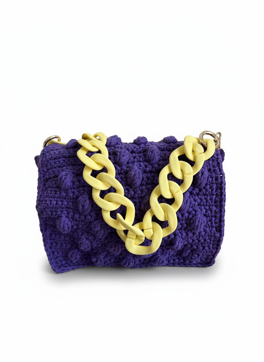إطلالة لافتة وذوق راقٍ في قطعة واحدة؛ حقيبة كروشيه متوفرة بعدة الوان مع سلسلة عريضة باللون الأصفر تضيف لمسة عصرية مميزة، وتكمّل ستايلك اليومي والمشاوير الخاصة بكل أناقة.