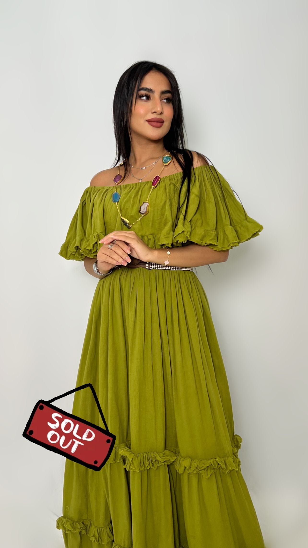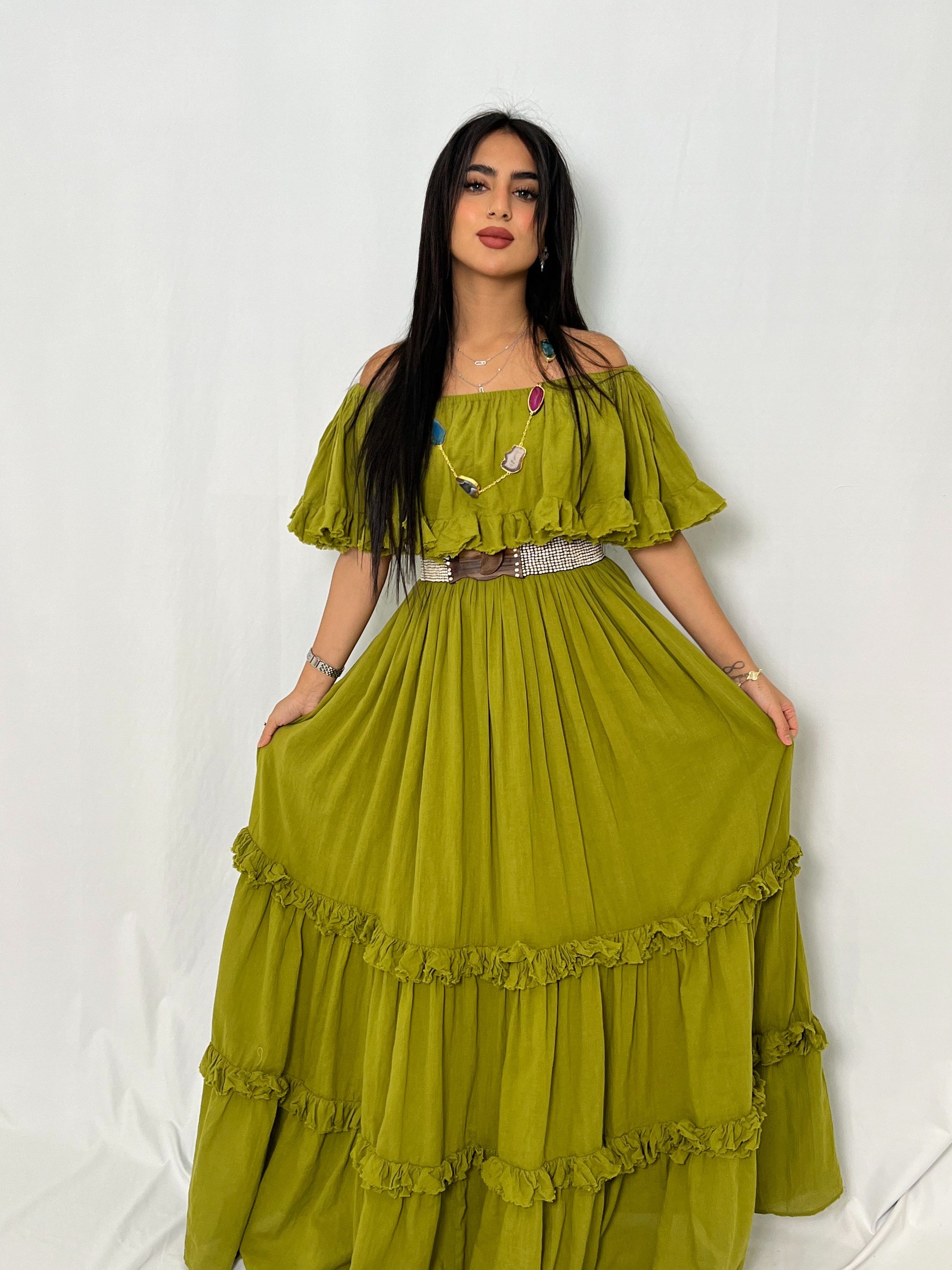 إطلالة صيفية راقية تبدأ من فستان ماكسي باللون الأخضر الزيتوني بتصميم أنثوي يجمع بين البساطة والفخامة؛ قصة الأكتاف المكشوفة تمنحك حضورًا ناعمًا، وتفاصيل الكشكش الانسيابية تضيف حركة جذّابة تجعل الفستان خيارًا مثاليًا للمناسبات النهارية والمساءات الصيفية.