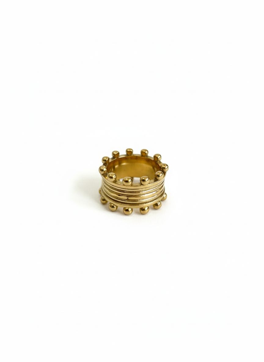 لمسة فخامة هادئة تكمّل إطلالتك من أول نظرة؛ خاتم ذهبي بتصميم هندسي يجمع بين الطابع العصري وأناقة التفاصيل الدقيقة، مع حبوب معدنية صغيرة تزيّن الحواف وخطوط متداخلة في المنتصف تمنحك حضورًا راقيًا يناسب كل مناسبة.