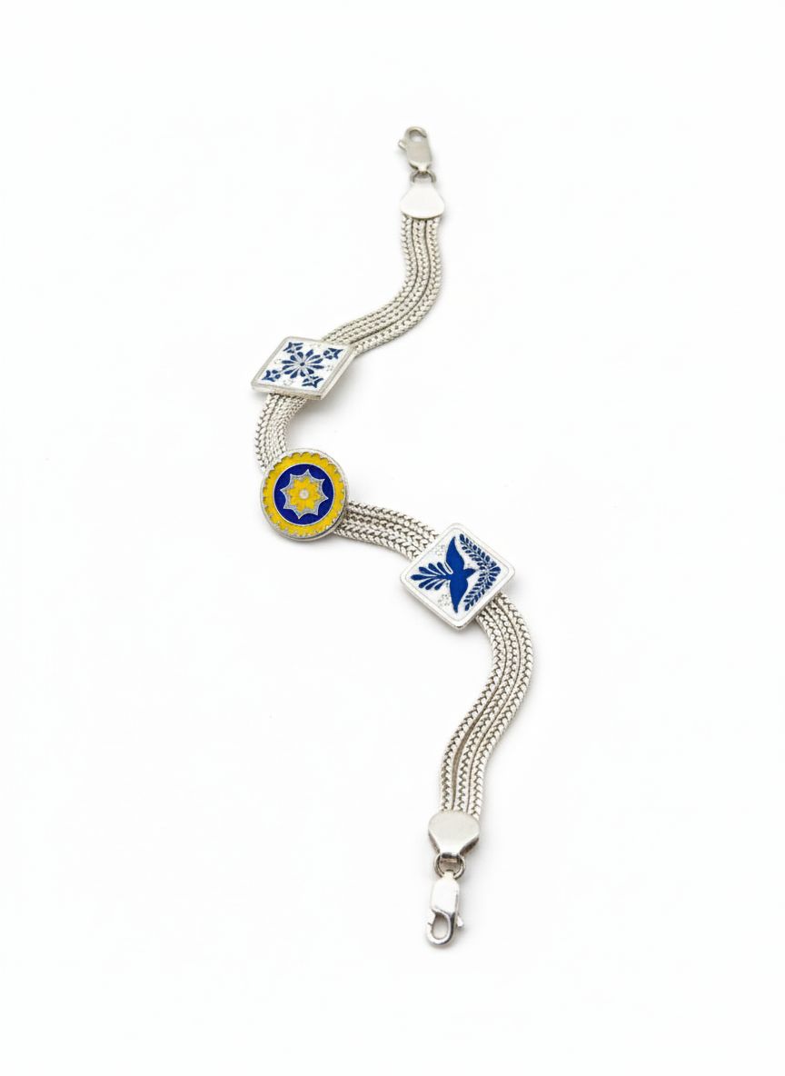 أسورة فضية أنيقة بتصميم فني مستوحى من الزخارف الشرقية التقليدية، يجمع بين الأصالة والفن المعاصر. يلفت النظر بثلاث قطع مزخرفة بألوان الأزرق والأبيض والأصفر موزعة على امتداد السلسلة المعدنية المتعددة الخيوط ليمنحك لمسة فخمة تكمّل إطلالتك فورًا، سواء كانت يومية أو لمناسبة خاصة.
