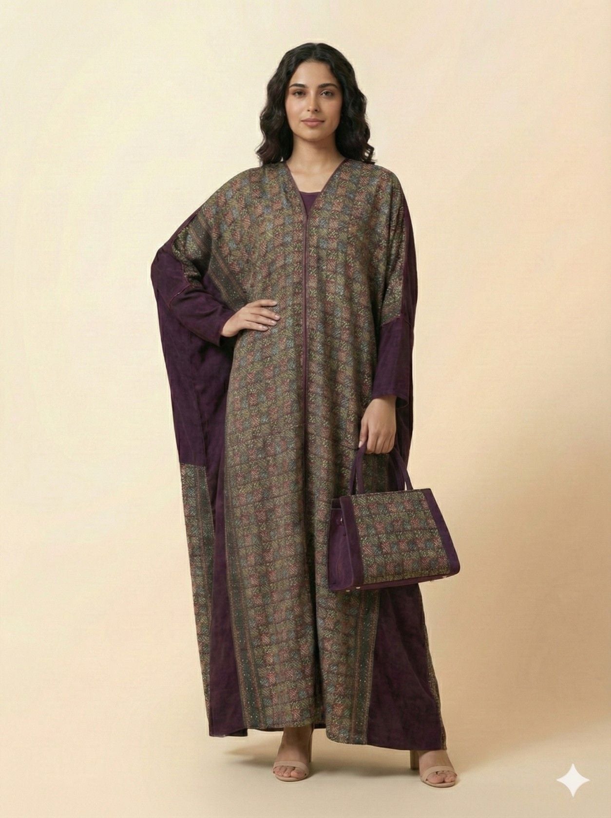 - تناسق لوني راقٍ: دمج اللون العنابي مع القماش المنقوش يمنحك إطلالة هادئة وفخمة تناسب الذوق السعودي.
