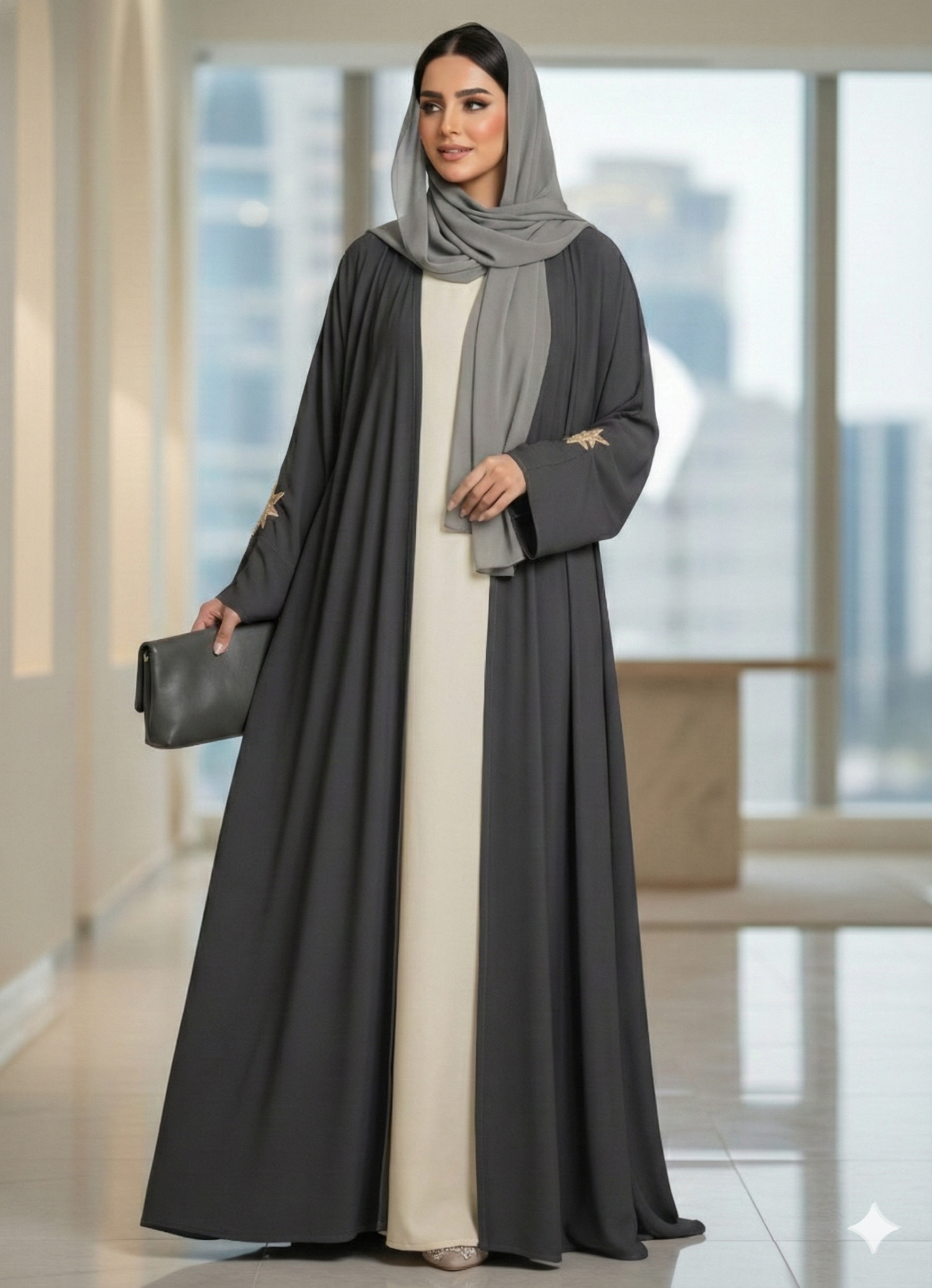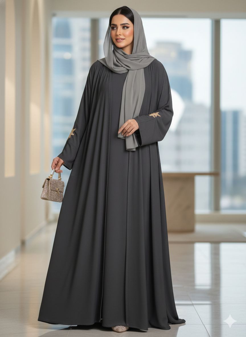 عباية بلون رمادي داكن بتصميم انسيابي ووقار واضح، تجمع بين البساطة الراقية ولمسة فخمة ناعمة بتطريز نجمة ذهبي على الأكمام، لتكون خيارك اليومي الأنيق للمشاوير والزيارات والمناسبات بكل ثقة.