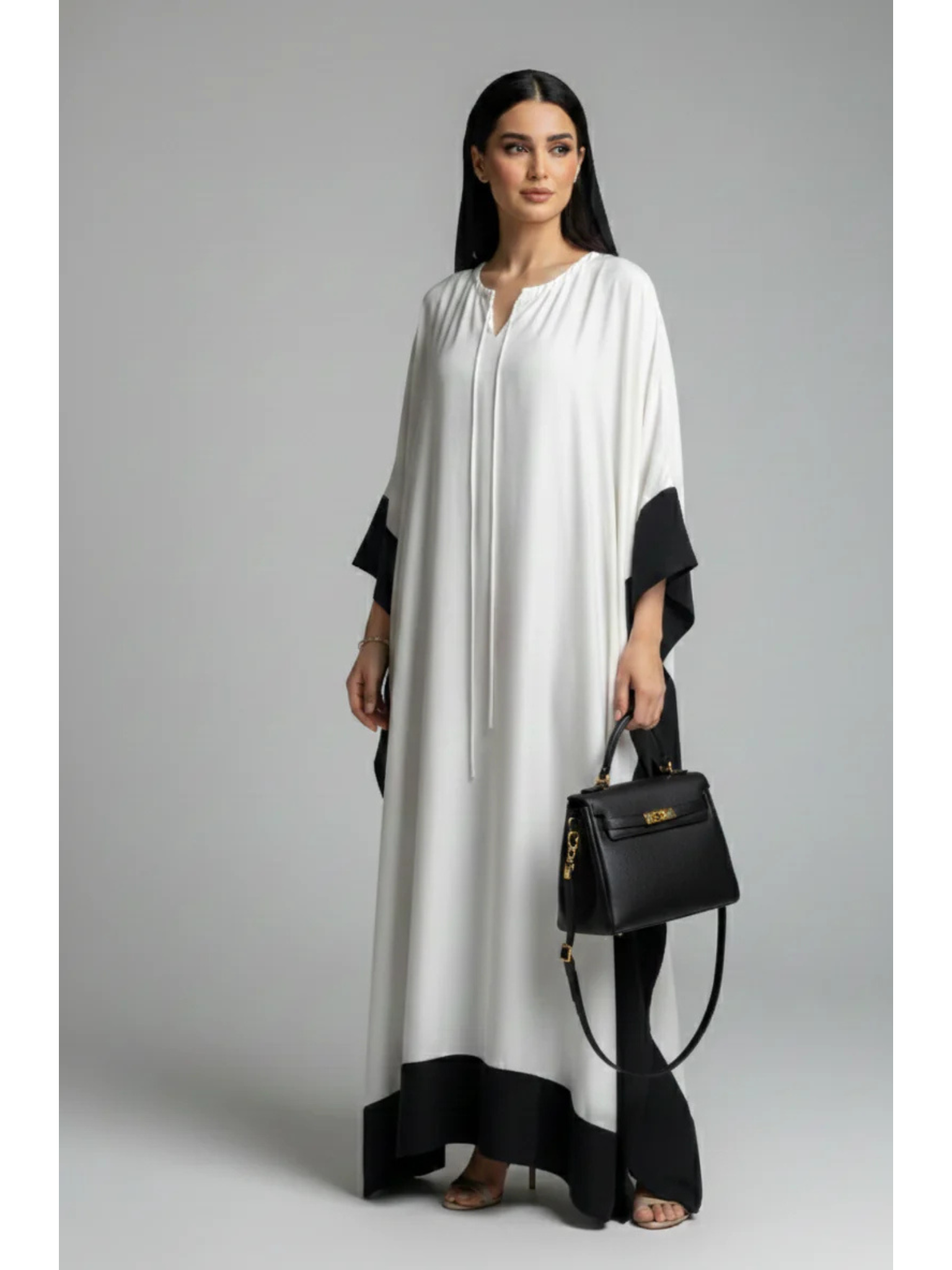 عباية بتصميم انسيابي راقٍ بلونين أبيض وأسود تمنحك حضورًا أنيقًا بلا تكلف، وتناسب إطلالاتك اليومية والمناسبات بذوق هادئ يلفت الانتباه. قصّتها الواسعة تمنحك راحة وثقة، مع تفاصيل لونية متوازنة تضيف فخامة واضحة من أول نظرة.